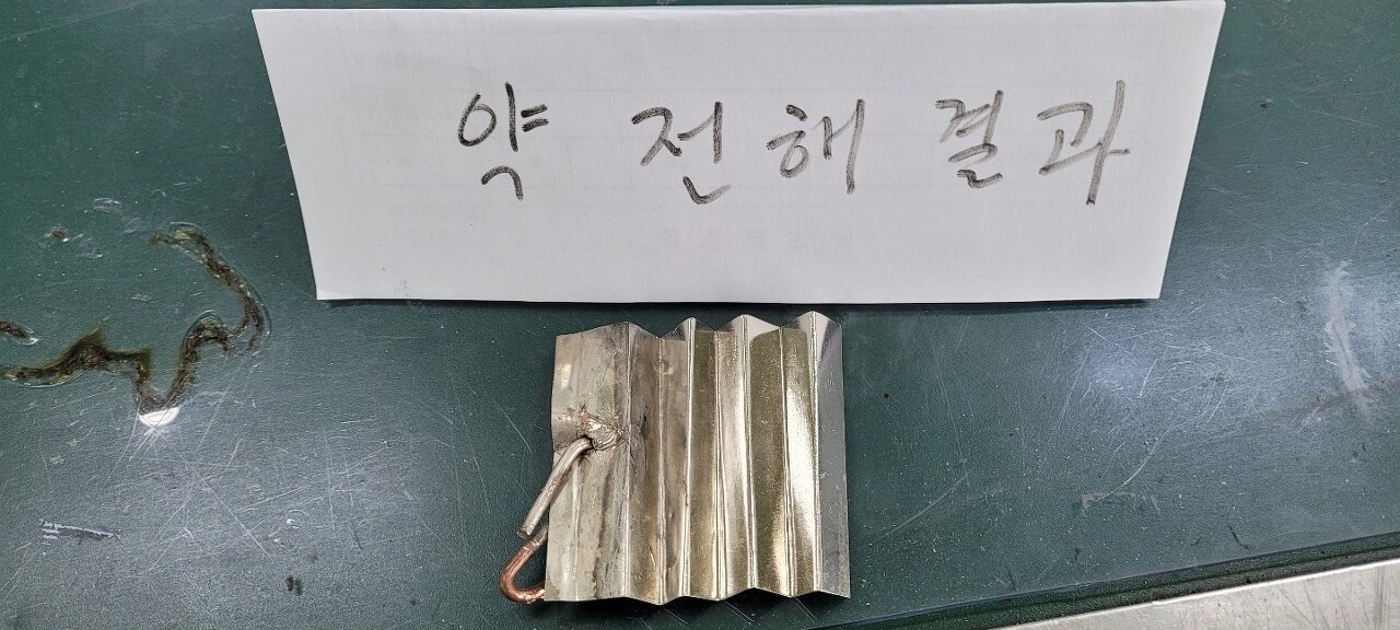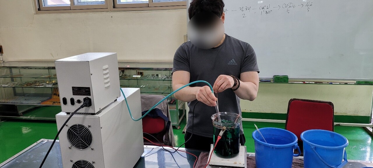 그 전에 용액 안의 불순물을 제거하기 위하여 약전해를 통한 불순물 제거작업을 실습해보았습니다.