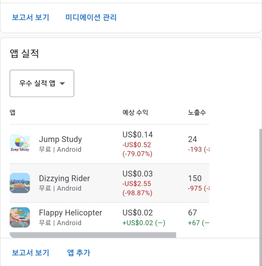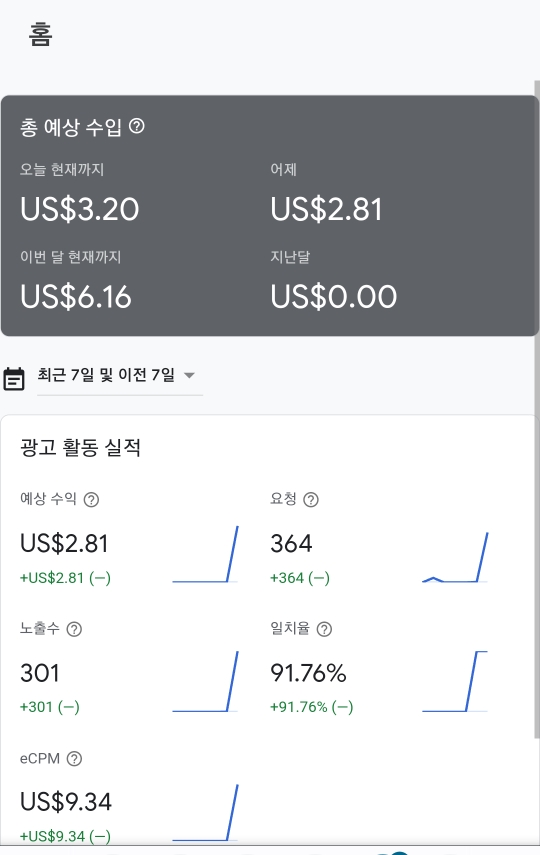 이런식으로 구글 애드몹에서 광고 활동 실적이라고 해서 광고에 대한 수익이 어느정도인지 확인을 할 수가 있었습니다.