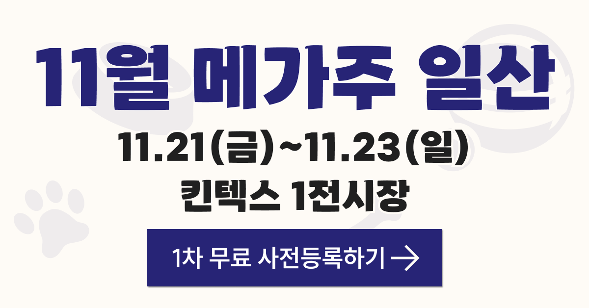 반려인이라면 다~ 아는 #메가주 하반기는 국내 최대 규모! 약 600개의 반려동물 브랜드가 총집합! 11월 21일(금) ~ 23일(일), 3일간 킨텍스에서 만나요! [1차 사전등록자 혜택] 전시기간 3일 내내 무료