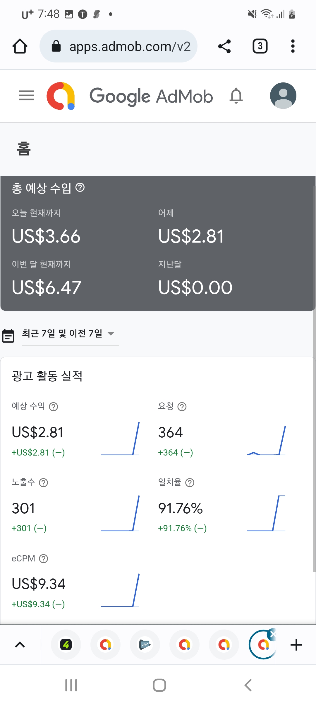 출시가 어제 되었고, 구글 애즈 광고로 하루 5달러 쓰는걸로 하고 설치 시 일정 금액 지불되는걸로 구글애즈 광고를 하니, 다운로드수가 급증하면서 수익도 오르고 있습니다.