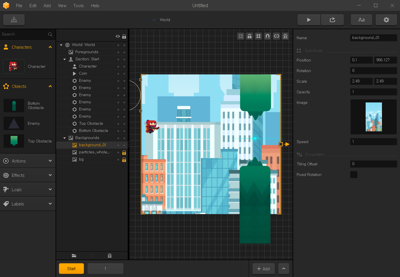 템플릿에서 게임을 선택하여 Create를 눌렀으면, 재생버튼을 눌러 해당 게임이 어떤 방식으로 진행이 되는지를 확인하고 플레이해보며 디자인 수정이나 장애물 등을 추가하거나 나만의 개성으로 게임을 완전 다른 게임으로 탈바꿈 할 수 있지 않을까요?