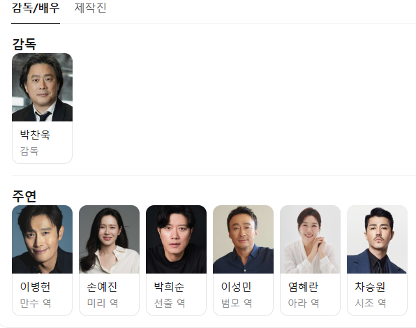 이 영화에서 가장 돋보이는 점은 단연 배우들의 연기력입니다. 주연 배우들은 캐릭터의 심리를 섬세하게 그려내며, 작은 표정 변화나 눈빛 하나만으로도 관객에게 캐릭터의 내면을 전달합니다. 특히 감정의 폭이 넓은 장면에서는 배우들의 호흡과 시선 처리, 대사의 톤까지 완벽하게 맞아떨어지며 몰입감을 극대화합니다. 조연 배우들 역시 주인공과 자연스럽게 어우러지며 각자의 역할을 충실히 수행합니다. 이런 뛰어난 연기력 덕분에 영화의 난해한 부분도 어느 정도 보완이 되며, 장면 장면마다 캐릭터에 공감하게 만드는 힘이 있습니다. 연기만 놓고 본다면, 관객은 분명 박찬욱 감독의 캐스팅 선택에 높은 점수를 줄 수밖에 없습니다. 다만 연출과 내용이 다소 난해한 만큼, 연기를 제대로 즐기기 위해서는 집중력이 필요합니다.