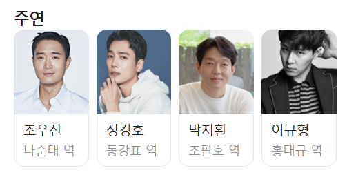 영화 보스의 주연 출연진으로는 조우진(나순태역), 정경호(동강표역), 박지환(조판호역), 이규형(홍태규역)이 있습니다.